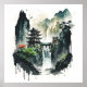 En vacker kvadrat poster ett bläck-exempel på ett landskap med gammal kinesisk arkitektur och stora vattenfall.