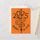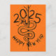En skiss av en orm som är insvept kring träd gren. Ormen har en öppen mun som avslöjar vassa tänder. Det finns texten "2025" skriven ovanför ormen. Under ormen finns texten "Gott nytt år". Bakgrunden är en levande orange färg.