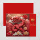 Ljust röd Drake omgiven av peonior och moln. Design på liggande vykort med gyllene Gott Nytt År på kinesiska och litet Gott Nytt År på engelska + 2024 + gyllene Drak-ideogram. Du kan enkelt ändra positionen för elementen (text, bild) eller ta bort dem om du behöver genom att klicka på knappen "REDIGERA DESIGN". Matchande gratulationskort. Perfekt för kinesiskt nyår för Draken 2024 eller födelsedag (personer födda under Drakens år).