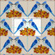 Den här fantastisk-mönstrade hantverksväven har ett par söta blå jays. En fågel från kråkan med vackra ljusblå fjädrar och en vapensköld på huvudet. Bläcket är svart och magen en skugga av blått grått. Fåglarna är mot varandra och nästan kysser varandra. Mellan dem finns en hög av fall Oak löv och en enda örn, en symbol för deras kärlek som också återspeglar insamlingen av akvarier från dessa fåglar under hösten. En fin design för att fira Bröllop, särskilt under hösten eller hösten.