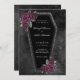Mörkt och vackert, denna kistbröllopsinbjudan är perfekt för ett gotiskt eller Halloween-bröllop. Kistan har silverglitter runt kanterna och lila rosor med guld- och gröna blad. Linjerna vid kanterna av inbjudan är en fin touch. Bakgrunden är en dyster svart akvarell som får kistan och blommorna att verkligen sticka ut.
