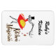 En anpassningsbar kylmagnet med skript brev som läser Kitchen Magician med en magisk kockflicka med gnista retro brev i svart, röd och gult.