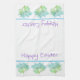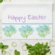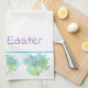Helgdag kökshandduk som visas i vitt med ett färskt utandningsluft av vår i köket med blått och grönt Påsk Lily mönster vid handduvens kant med himlar blå rand och Glad påsk i lavender-lila. Anpassa det här objektet eller köp som det är.