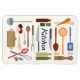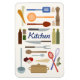 Färgbilder och typografisk design av köksartiklar och livsmedelsingredienser på gräddbakgrunden färg.