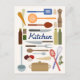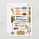 Färgbilder och typografisk design av köksartiklar och livsmedelsingredienser på gräddbakgrunden färg.