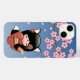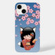 Vektorillustration av en söt, oriental flicka med svart räv öron och svan i en röd kimono-klänning med stort obi-streck med ett målat fläkt. Flickans svarta hår är dekorerat med blommor och geisha stil hårnålar. Kitsune elak fox på japanska. Denna teckning inspirerades av Japans traditionella kokeshi-dockor. Blooming Sakura träd gör en enkel bakgrund.