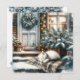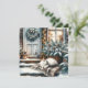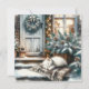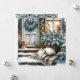 Personligens julkort. En söt vattenfärgsillustration av en liten vit kattunge som sover på en filt på framsidan av en porch till ett gammalt rustiskt lantbruk.