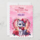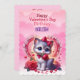 Ett personlig födelsedagskort för någon som fyller år på Alla hjärtans dag. En söt kattunge omgiven av röda och rosa tillbehör med hälsning inuti.