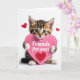 This sweet card features an adorable kitten gazing forward with wide, trusting eyes that instantly capture the heart. Its soft tawny stripes and bright white paws stand out against a simple white background. The kitten holds a large pink heart in its tiny paws, decorated with white polka dots and a smaller red heart. Across the heart, the words “Friends fur-ever!” appear in crisp white lettering. Two red hearts float near the top corners, adding extra warmth. Gentle lighting highlights the kitten’s fur and brings a cozy glow to the scene. This card shares a message of friendship, kindness, and affection, making it perfect for Valentine’s Day.