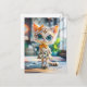 Ett bra exempel på en kvinnlig kattunge med en mönstrad klänning som står i ett mysigt rum. Perfekt för barnteman, vismkonst och lekfull dekorativ design.