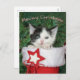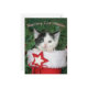 En söt baby kattunge som kissar underligt av en röd Jultomten-boskapsuppfödning under Julgran. Det kattunge porträtt-fotot som Katho Menden tog, detta Meowy-julkort är avsett för katt och djurälskare. Anpassa den med ditt namn eller din text.