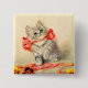 Knapp med Meta Plückebaums teckning Kitten med rött band (b. 1876). En grått kattunge med mörk rand är vackert försedd med ett rött band. Kattungen leker med ett bi. Gula blommor dekorerar förgrunden. En underbar gåva till kattälskare och tyska konstentusiaster!
