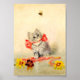 Poster med Meta Plückebaums teckningar Kitten med ett rött band (b. 1876). En grått kattunge med mörk rand är vackert försedd med ett rött band. Kattungen leker med ett bi. Gula blommor dekorerar förgrunden. En underbar gåva till kattälskare och tyska konstentusiaster!
