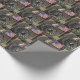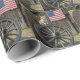 An adorable orange kitten sits atop a wooden wagon wheel. In the background, a hay bale and an American flag are visible against a rustic barn wall