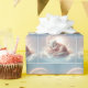 En flytande vit kattunge som svävar i fred med krescent måne, inslagen i en mjuk rosa filt
