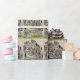 Sex vackra kattungar som alla bär rödbögar sitta i en gult och blå basket i trädgården. Två verkar ha fått reda på hur man klättrar upp och kollar upp de söt rödblommorna i gräset.