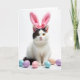 Designed with a studio-style look, this card features a white cat with a dark patch framing one eye and ear, sitting calmly against a plain white background. A fluffy pink headband with tall bunny ears and a small bow rests on its head, adding a sweet, slightly silly touch 🐰. The cat’s golden-amber eyes look straight ahead with a gentle, friendly focus, like it’s posing for someone it trusts. Soft, diffused lighting highlights the fur and whiskers, keeping the scene tender and close-up rather than dramatic. Near the bottom, several smooth egg-shaped decorations in pastel blue, lavender, and soft pink are arranged around the cat’s paws, bringing in a springtime feel 🌷. The greeting “Happy Easter” appears near the top in pink lettering, with a smaller line of text centered beneath it in light gray. The white background stays uncluttered, letting the pink ears and pastel eggs stand out clearly.