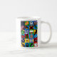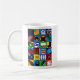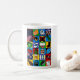 En kaffemugg med ett rutnät av kiwiana-objekt avbildade på varje sida av muggen. © Radenbrea Studios på Zazzle, En fantastisk mugg att ge som present till alla som älskar Nya Zeeland.