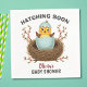 Vuxna babyduschservar med en chick av söt gult från ett blått äggskal i ett mysigt bo omgivet av känsliga blommar av rosa vår.