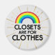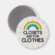 Den tematiska magneten i gay pride har stor regnbåge med "kläder är till för kläder" i fet svart text på lätt grått-bakgrund med guld-stjärnsprängning