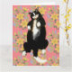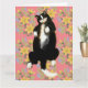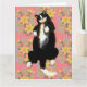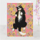 Akvarellmålning av en svartvit klädkatt, blommig bakgrund.