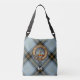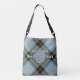 Klan Bell vapensköld-bricka omgiven av ett band och ett låsbeslag över tartanbakgrunden. Anpassningsbar på båda sidor.