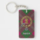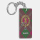 Klan Crawford vapensköld-bricka omgiven av ett band och ett låsbeslag över tartanbakgrunden. Anpassningsbar på båda sidor.