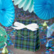 Traditionell skotsk präglade mönster i blå och grönt, med ljusröda, svarta och vita högdagrar.