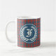 Kaffe mugg med den gamla klan tartan för frasern av familjen Lovat och dess septer. Vintage Scottish plaid mönster i korallrött, ljusblått och grönt, med vita accenter. Har en rund ljusblå bricka med lagrar på båda sidor om mugg med ditt monogram som första påslag i ett gammalt engelskt teckensnitt.