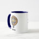 Klan Hannay vapensköld-bricka omgiven av ett band och ett låsbeslag över tartanbakgrunden. Anpassningsbar på båda sidor.