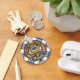 Klan Hannay vapensköld-bricka omgiven av ett band och ett låsbeslag över tartanbakgrunden. Anpassningsbar på båda sidor.