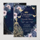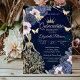 Guld glittertiara, klänning, stjärnor, fjärilar och blommor på en blå bakgrund. Inbjud gästerna att dela din glädje och fira denna milstolpe med en design som speglar magin och glädjen av din quinceañera.