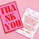 Vi presenterar vårt "tack"-kort som säkert kommer att göra ett djärvt intryck! Med en groovy 70-talsinspirerad design, har detta retro-kort starka röda och rosa färger som garanterat fångar ögat.