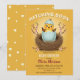 Bedårande baby shower inbjudan med en söt gul kyckling som kläcks från ett blått äggskal i en mysig rede, omgiven av ömtåliga rosa vårblommor.