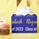 Omslagets pappra är mörk blått. Den har texten mönster för student namn och klass 2023. Namn (Visa: Elizabeth) visas i ett elegant faux-skript (inte foil) guld. Den andra texten är vit. All text kan redigeras.