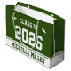 Royalets lila och vita presentsäck säger "Klass 2025" i stor vit text. (Du kan ändra året om du behöver.) Vid grund finns det en text om grönt av skogar som du kan ändra för att visa rätt namn för student. White student är på vardera sidan om frasen "Class of".
