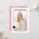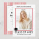 Klass på 2023: Skrivarröd rand studenten fotoinbjudan. Baksidan innehåller ett rött och vitt mönster med rand.