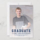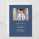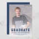 Studenten-meddelande med ett foto av lodrät anpassningsbar på framsidan och ett mindre vågrät på baksidan. "Student" i ord visas i fet marin, blå typografi med ett sportsligt kollegialt utseende som passar perfekt för idrottsmannen i student, där student namn, skolan och året i studenten ligger nedanför i sans serif-typsnitt. Lägg till information om student prestationer och framtida planer på baksidan i vit sans serif-teckensnitt på en marin blå bakgrund. Ett val av bra för högskoleexamen eller högskoleexamen.