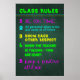 Färgtext på gröntens bakgrund i kretskort säger: Klass Regler _____________________ 1. Var i tid 2. All personlig elektronik som alltid är placerad på plats 3. Visa varandra respekt 4. När läraren pratar - du är tyst 5. Behålla en Perfekt för lärarinställning i ditt liv!