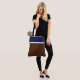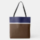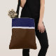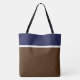 Den här eleganta chicen har en stor marin blå övre rand, skisserad i vitt, ovanför ett brunt färg-block med vibrerande mörk som fyller resten av designen.