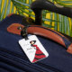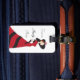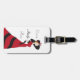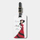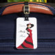 En flicka i en röd klänning och svart hatt med långa svarta handskar