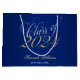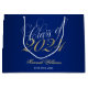 En elegant-skripttypsklass på 2024 studenten-presentsäck. Visas i guld, vitt och marint blått. Mönster är platt tryckta illustrationer/grafik - INTE FAKTISKT GOLD FOIL.