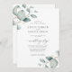 Rustic botanical boho chic vackra emerald sage grönt dammig blå guld-vattenfärg eucalyptus grenar bröllopsinbjudan med elegant klassisk manus.