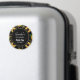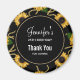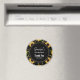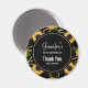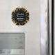 Födelsedagsmagnet med ett elegant och stilrent mönster. Vackra gula solrosor och gröna blad omgivna av ömtåliga guldkedjor. Svart bakgrund. En svart cirkel med en falsk guld inre kant ovanpå med din text inuti.