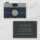 En visitkort med en kamerasymbol som design. Blått- och grå färgtext för personifiering av specificerar. En enkel, yrkesmässig och modern visitkort för fotografer eller affärer som handlar med kamerautrustning.