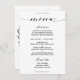 En klassisk middagsmeny med förrätter, huvudrätter och efterrätter. Titlarna är skrivna med en klassisk svart svajig font kalligrafi och menyvalen är i en lättläst blocktext. Menyn är helt anpassningsbar för alla tillfällen.