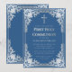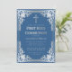 Denna eleganta blå och silver första kommunion inbjudan med vintage-känsla, rekommenderas för en pojke, har en utsmyckad falsk silverfolie ram med eleganta barocka silvergrå dekorationer på en klassisk blå bakgrund. Ovanför texten finns ett religiöst kors i falsk silverfolie. Förutom tillfället "Första heliga kommunionen", som också är i falskt silver, kan all text anpassas och har en silvergrå färg liknande den falska silverramen.