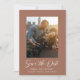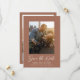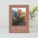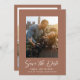 Elegant bröllop sparar datumkortet med en enkel och minimal design med "Spara datum" i en modern typografi tillsammans med din händelseinformation under lodräts favoritbild. Baksidan har ett andra bild tillsammans med en valfri textrad över bild grund. Temat färg är koppar/rost och kan ändras i designredigeringen av verktyg. Det är underbart om du har ett informellt eller formellt bröllop.