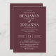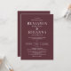 Klassisk inbjudan och elegant bröllop med maronröd bakgrund och vit brev. Endast text med traditionell ordalydelse. Pappra alternativ för digital utskrift eller fysisk utskrift. Anpassa den till namnen av Mr. och Mrs., plats, register, OSA information och alla detaljer som du behöver ta med. Matchande svitprodukter finns.