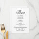 Formellt svartvitt bröllop-menykortsformat har en vacker typografi som kombinerar ett traditionellt blomstrande kalligrafiskt skript med klassiskt blockeringsbrev på en ren vit bakgrund. Innehåller en dekorativ dekorativ dekorativ dekorativ dekorativ dekorativ rulla. Anpassningsbarna kan vara personlig med ett monogram av datumet namn och bröllop och middagsmenyinformationen för bröllopsdagen. Var snäll och handla vår klassiska Elegant Black and White Bröllop Collection för att samordna designen.